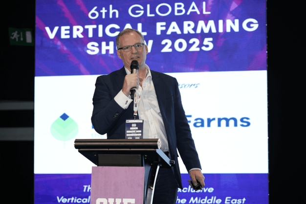 Tristan Fischer speaking at the Global Vertical Farming Show 2025 in Dubai