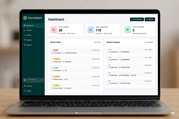 The platform can operate independently of Nordetect analyzers, but also supports automatic synchronization with the company's hardware for users already working within the Nordetect ecosystem. It is designed around laboratory reporting workflows rather than production system types. According to Pinto, it does not differentiate between greenhouse and vertical farm operations, as its analysis depends on the lab report PDFs being uploaded.
