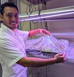 Picture, right: Byron Manzanero showing lettuce seedlings and how the inoculation process occurs in the laboratory. Lettuce seedlings are bagged after the pathogen inoculation; in these conditions of high humidity and high temperatures, the pathogen easily proliferates.